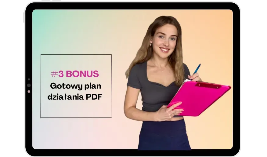 Przejrzysty PDF, który poprowadzi Cię krok po kroku. Dzięki niemu wiesz, co robić, żeby iść do przodu – bez błądzenia, zastanawiania się i zaczynania w kółko od nowa.